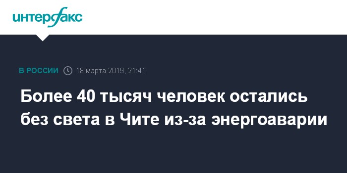 Москва. 18 марта. INTERFAX.RU - Энергоавария в Забайкальском крае стала причиной отключения света у значительного количества абонентов в региональном центре, сообщается на сайте Минэнерго РФ.