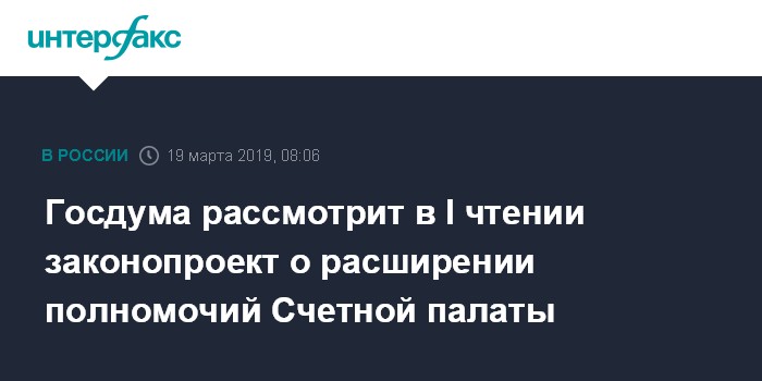 Москва. 19 марта. INTERFAX.RU - Госдума на заседании во вторник планирует рассмотреть в первом чтении законопроект, который расширяет полномочия Счетной палаты (СП) РФ.