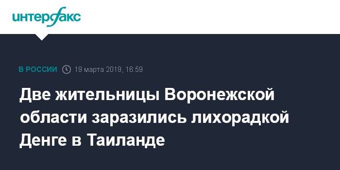 Москва. 19 марта. INTERFAX.RU - Две жительницы Воронежской области заразились лихорадкой Денге на отдыхе в Таиланде, сообщили "Интерфаксу" в пресс-службе регионального управления Роспотребнадзора.