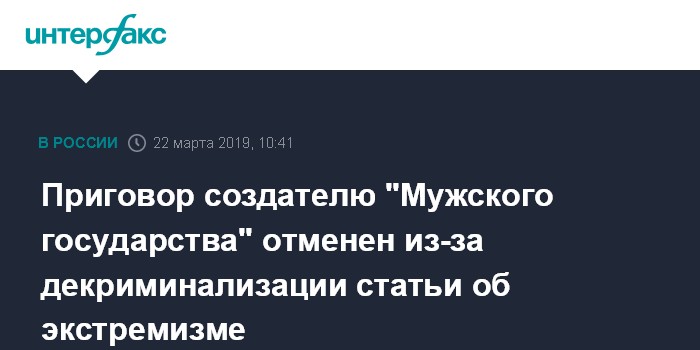 Приговор создателю "Мужского государства" отменен из-за декриминализации статьи об экстремизме