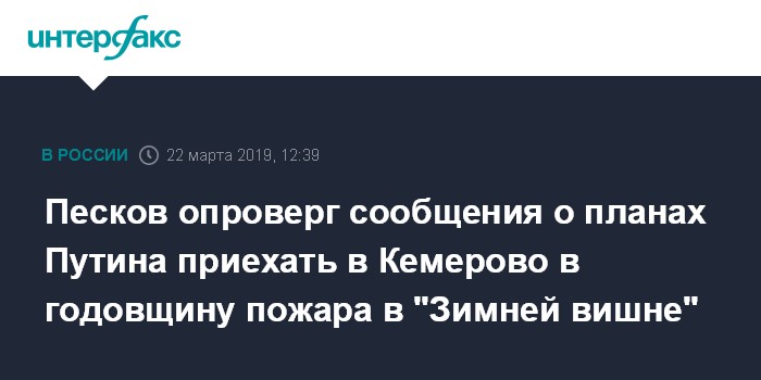Москва. 22 марта. INTERFAX.RU - Президент РФ Владимир Путин не планирует посещать Кемерово в годовщину пожара в торгово-развлекательном центре "Зимняя вишня".
