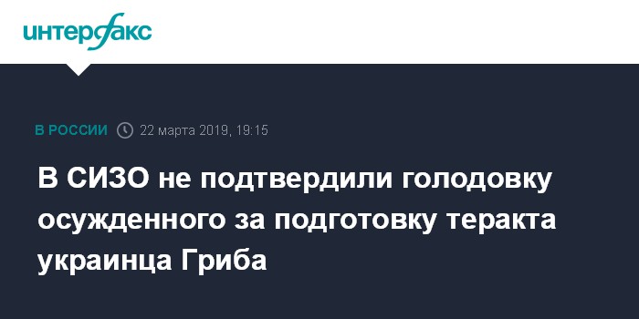 Москва. 22 марта. INTERFAX.RU - Украинец Павел Гриб, которого суд в РФ приговорил к шести годам лишения свободы за подстрекательство к теракту, после возвращения в СИЗО продолжает принимать пищу, сообщил председатель Общественной наблюдательной комиссии Ростовской области Леонид Петрашис.