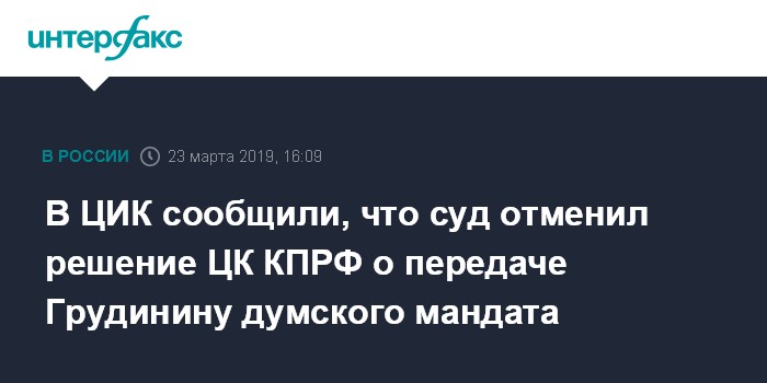 Москва. 23 марта. INTERFAX.RU - Столичный суд признал незаконным решение ЦК КПРФ о передаче экс-кандидату в президенты России Павлу Грудинину мандата депутата Госдумы, ставшего вакантным после смерти Жореса Алферова, сообщил в субботу "Интерфаксу" зампред Центризбиркома Николай Булаев.