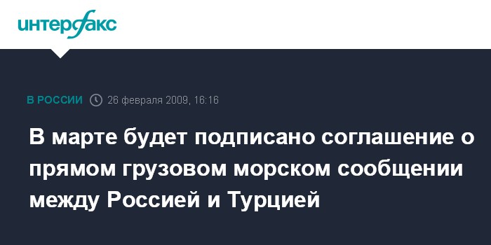 Москва. 26 февраля. INTERFAX.RU - Соглашение о прямом грузовом морском сообщении с Турцией будет подписано в марте этого года, сообщил глава Минтранса РФ Игорь Левитин.