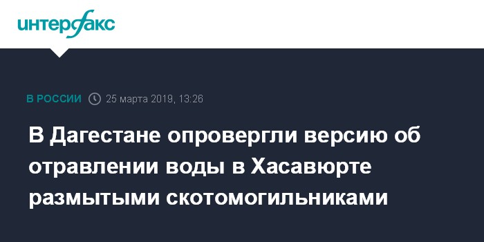 Москва. 25 марта. INTERFAX.RU - В Дагестане назвали несостоятельной версию о том, что массовое отравление людей в Хасавюрте связано с загрязнением воды из-за размытых скотомогильников.