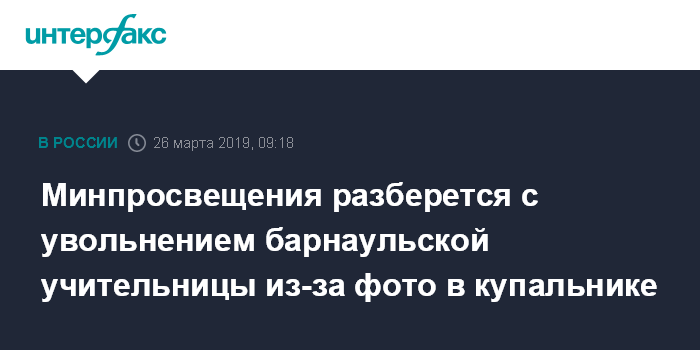 Москва. 26 марта. INTERFAX.RU - Министерство просвещения России пообещало разобраться в причинах увольнения учительницы из Барнаула, чья фотография в закрытом купальнике стала причиной внутришкольного конфликта.