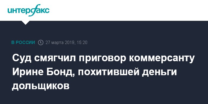 Москва. 27 марта. INTERFAX.RU - Президиум Санкт-Петербургского городского суда смягчил приговор генеральному директору ООО "Девелопмент Групп" Ирине Бонд, осужденной за мошенничество с квартирами дольщиков.