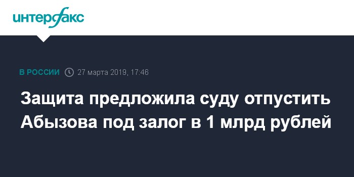 Москва. 27 марта. INTERFAX.RU - Защита экс-министра Открытого правительства России Михаила Абызова, обвиняемого в хищении 4 миллиардов рублей, попросила суд отпустить его под залог в 1 млрд рублей или поместить под домашний арест, передал корреспондент "Интерфакса" из Басманного суда.