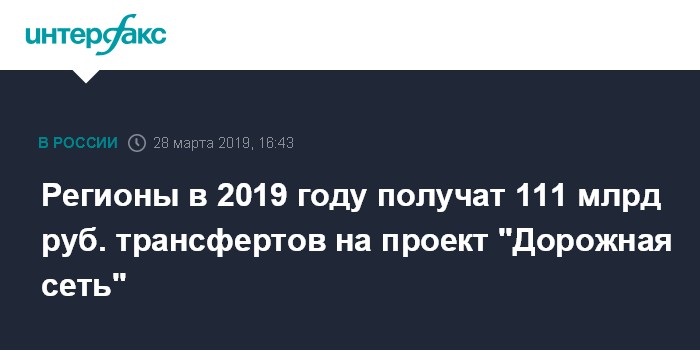 Москва. 28 марта. INTERFAX.RU - Регионы РФ в 2019 году получат более 111 млрд рублей в виде иных межбюджетных трансфертов на реализацию федерального проекта "Дорожная сеть".