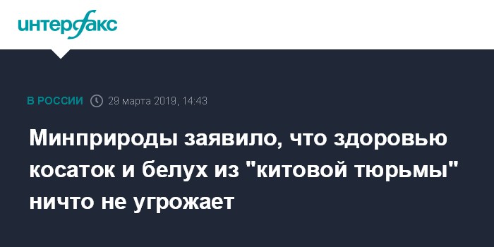 Москва. 29 марта. INTERFAX.RU - Состояние косаток и белух, находящихся в бухте Средняя Приморского края, не вызывает опасения у ученых, состояние животных оценивается как удовлетворительное, сообщили "Интерфаксу" в Минприроды РФ в пятницу.