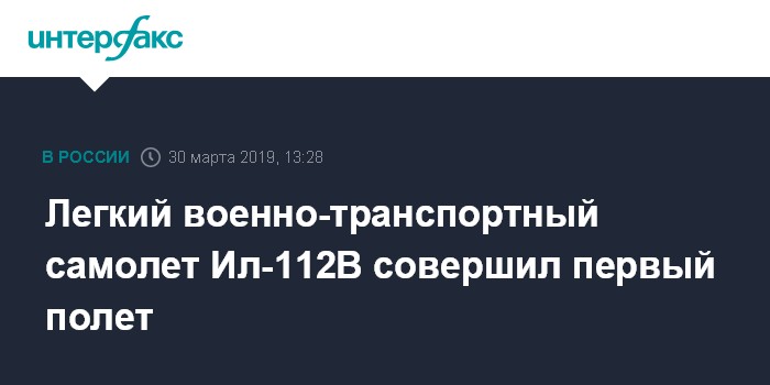 "30 марта с взлетно-посадочной полосы аэродрома авиастроительного предприятия ПАО "ВАСО" (входит в Дивизион транспортной авиации ОАК) в воздух поднялся первый опытный образец легкого военно-транспортного самолета Ил-112В, построенного в рамках контракта с Минобороны России", - сообщила компания "Ил".