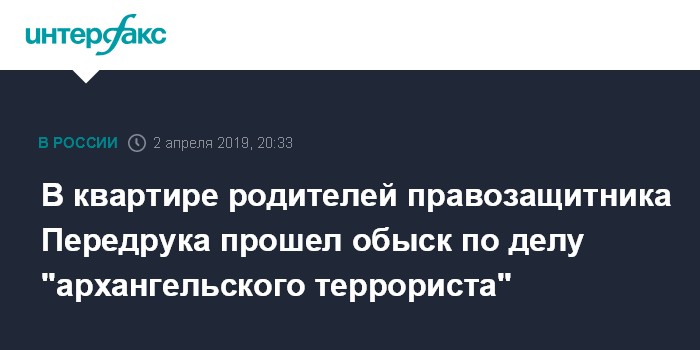 В квартире у московского знакомого "архангельского террориста" нашли элементы бомбыЧитать подробнее"Сегодня утром в доме моих родных прошел обыск, следователи изъяли компьютер и флешку. Исходя из того, что написано в протоколе обыска следует, их (следователей) задача - собрать информацию по уголовному делу, связанному с терактом в Архангельске в здании ФСБ и установить, в том числе, некую переписку с Жлобицким, но я с ним не был знаком никоим образом (...) и вся информация об этом уголовном деле, которая мне известна, известна из публичных источников", - сказал Передрук.