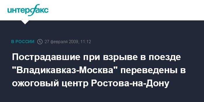 Москва. 27 февраля. INTERFAX.RU - Четверо пострадавших во время взрыва в вагоне-ресторане поезда "Владикавказ-Москва" в минувший четверг переведены в ожоговый центр больницы скорой медицинской помощи N 2 в Ростове-на-Дону.