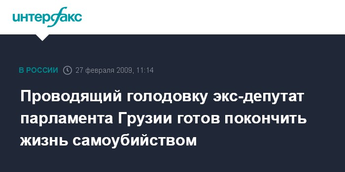 Москва. 27 февраля. INTERFAX.RU - Бывший депутат парламента Грузии Джемал Саджаиа, который пятнадцатый день проводит акцию голодовки в знак протеста в связи с выселением его многодетной семьи из дома, готов покончить жизнь самоубийством, если власти продолжат игнорировать его просьбу.