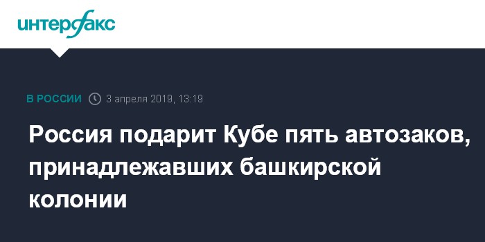 Москва. 3 апреля. INTERFAX.RU - Россия подарит Кубе пять автозаков на 36 млн рублей, ранее принадлежавших исправительной колонии в Башкирии. Соответствующее распоряжение правительства опубликовано на портале правовой информации.
