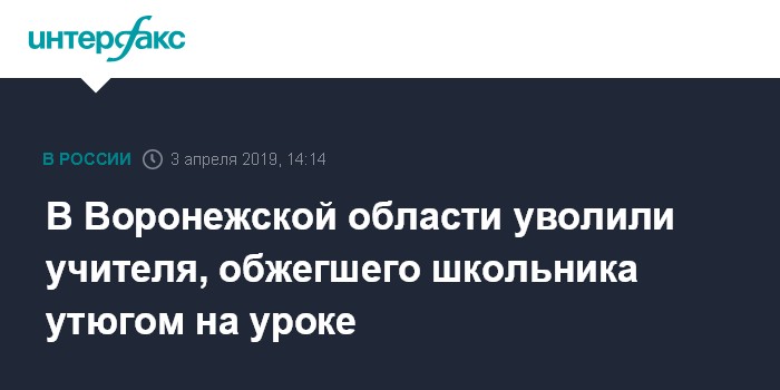 Москва. 3 апреля. INTERFAX.RU - Учитель Землянской школы Семилукского района Воронежской области, который на уроке технологии обжег ученика утюгом, уволен. Об этом сообщили "Интерфаксу" в региональном департаменте образования, науки и молодежной политики.