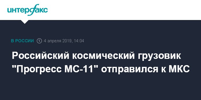 Москва. 4 апреля. INTERFAX.RU - Ракета-носитель "Союз" вывела на орбиту транспортный грузовой корабль (ТГК) "Прогресс МС-11" после старта с космодрома "Байконур" в четверг, передает корреспондент "Интерфакса" из подмосковного Центра управления полетами.