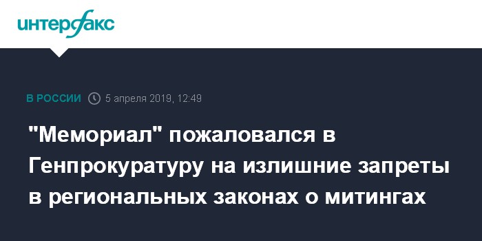 "Мемориал" направил шесть заявлений в Генпрокуратуру России о несоответствии региональных законов о митингах федеральному законодательству. В документах указаны Оренбургская и Сахалинская область, ЯНАО, НАО, Адыгея и Бурятия", - говорится в сообщении центра, поступившем в "Интерфакс" в пятницу.
