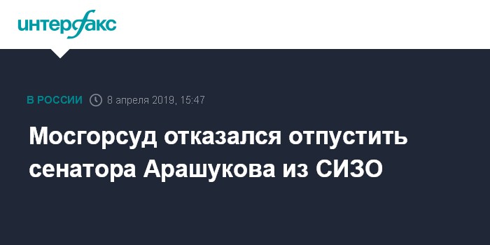 Москва. 8 апреля. INTERFAX.RU - Мосгорсуд в понедельник признал законным продление ареста временно отстраненному от должности сенатору Рауфу Арашукову, обвиняемому в организации убийств и участии в преступном сообществе, передал корреспондент "Интерфакса".