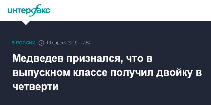 Москва. 10 апреля. INTERFAX.RU - Премьер-министр РФ Дмитрий Медведев признался школьникам, что в 10-м классе получил двойку в четверти по одному из предметов, но в итоге исправил ситуацию.