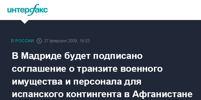 "Межправительственное соглашение о транзите через территорию РФ военного имущества и персонала в связи с участием Вооруженных сил Испании в усилиях по стабилизации и восстановлению в Афганистане будет подписано в ходе государственного визита в Мадрид 1-3 марта президента России Дмитрия Медведева", - сообщил "Интерфаксу" помощник президента РФ Сергей Приходько.