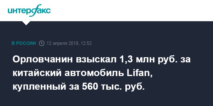 Москва. 12 апреля. INTERFAX.RU - Суд в Орле принял решение взыскать с ООО "Лифан Моторс Рус" в пользу местного жителя более 1,3 млн рублей за автомобиль, купленный с производственным браком.