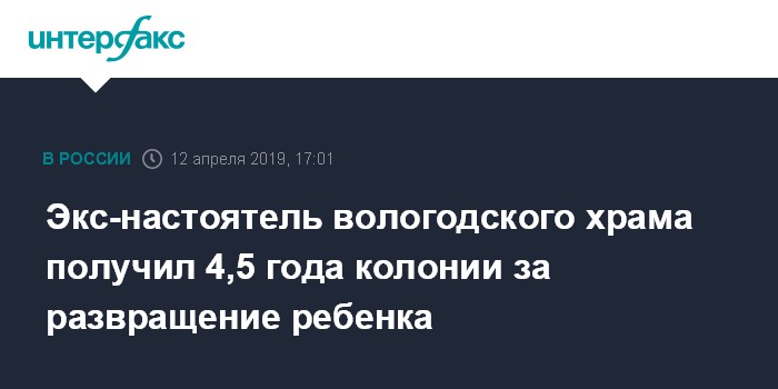 Москва. 12 апреля. INTERFAX.RU - Бывший настоятель храма в Вологодской области, из семьи которого изъяли приемную дочь, возбудив дело о ее изнасиловании, получил срок за развращение 12-летней прихожанки, сообщает в пятницу пресс-служба регионального управления СКР.