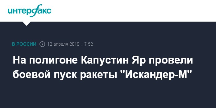 Москва. 12 апреля. INTERFAX.RU - Ракетчики дислоцированной в Ленинградской области бригады произвели пуск ракеты "Искандер-М" на полигоне "Капустин Яр" в Астраханской области. Об этом сообщили "Интерфаксу" в пресс-службе Западного военного округа.