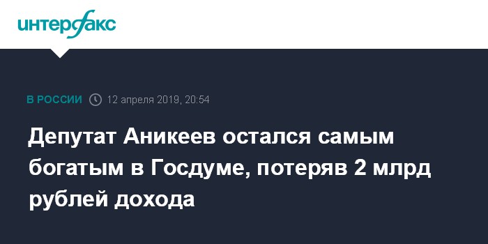 Москва. 12 апреля. INTERFAX.RU - Депутат фракции "Единая Россия" Григорий Аникеев продолжает оставаться самым богатым депутатом Госдумы с 2,3 млрд рублей дохода за 2018 год, свидетельствуют данные о доходах депутатов за 2018 год на сайте нижней палаты парламента.