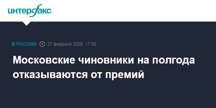 Москва. 27 февраля. INTERFAX.RU - В целях экономии бюджетных средств московские чиновники как минимум на полгода останутся без премий, сообщил мэр столицы Юрий Лужков на ежегодной встрече с ветеранами в пятницу.