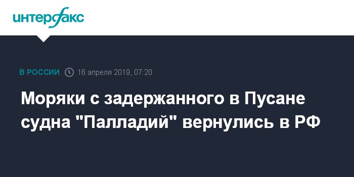 Москва. 16 апреля. INTERFAX.RU - Еще трое членов экипажа с задержанного летом 2018 года в южнокорейском порту Пусан российского судна "Палладий" вернулись домой, таким образом в РФ вернулись все моряки с этого танкера, кроме отбывающих наказание по приговору южнокорейского суда за попытку самовольно покинуть порт и сопротивление южнокорейской береговой охране.