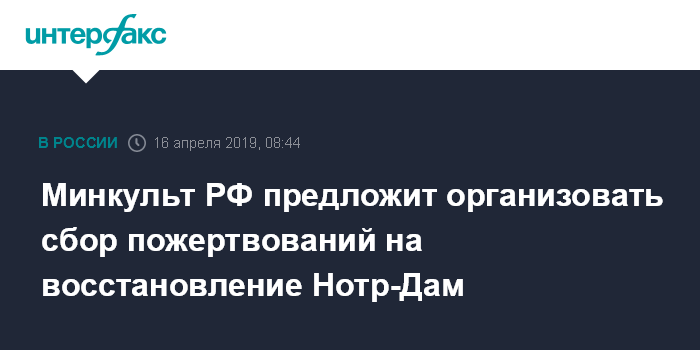 Москва. 16 апреля. INTERFAX.RU - Российский Минкульт предложит организовать сбор добровольных пожертвований на восстановление собора Парижской Богоматери, пострадавшего от мощного пожара накануне, сообщил "Интерфаксу" во вторник директор департамента музеев Минкультуры Владислав Кононов.