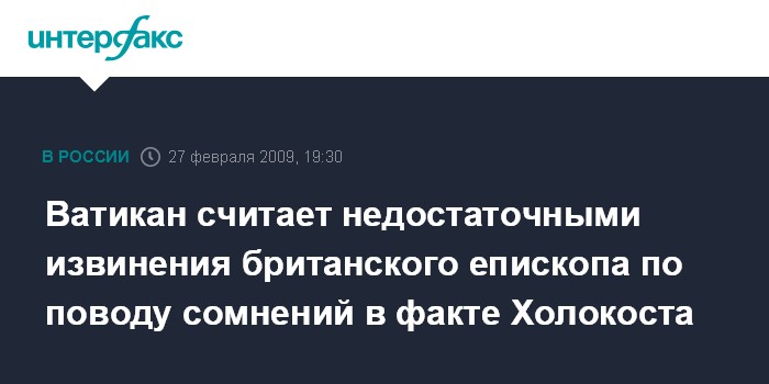 Лондон. 27 февраля. INTERFAX.RU - Ватикан объявил, что считает недостаточными извинения британского епископа Ричарда Уильямсона, заявлявшего, что отрицает факт Холокоста, информирует в пятницу британская телерадиокорпорация BBC.