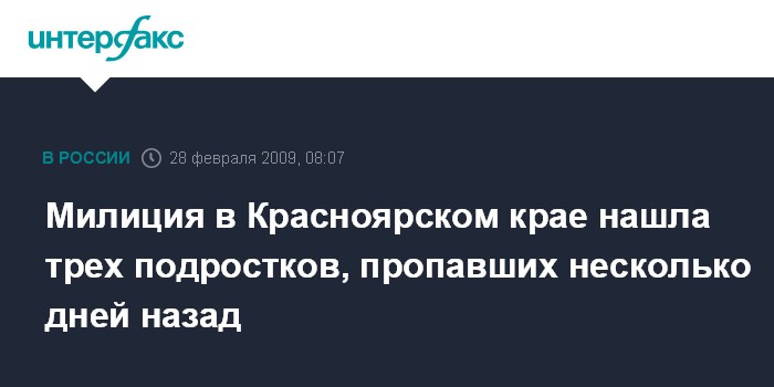 Красноярск. 28 февраля. ИНТЕРФАКС-СИБИРЬ - Трое подростков, пропавших три дня назад в Красноярске, обнаружены живыми и здоровыми, сообщает пресс-служба краевого ГУВД.