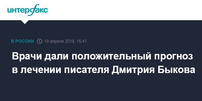 Москва. 19 апреля. INTERFAX.RU - Врачи дают благоприятный прогноз в лечении писателя и журналиста Дмитрия Быкова, госпитализированного в Уфе в минувший вторник, сообщил "Интерфаксу" председатель редакционного совета "Новой газеты" Дмитрий Муратов.