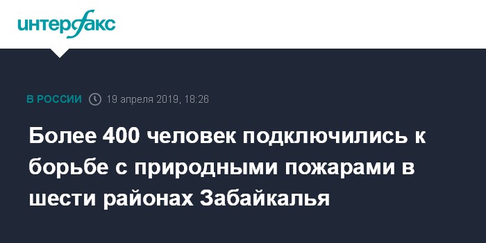Москва. 19 апреля. INTERFAX.RU - На борьбу с природными пожарами в шести районах Забайкалья, перекинувшихся на несколько населенных пунктов, брошены 427 человек и 58 единиц техники, сообщает в пятницу пресс-центр правительства региона.