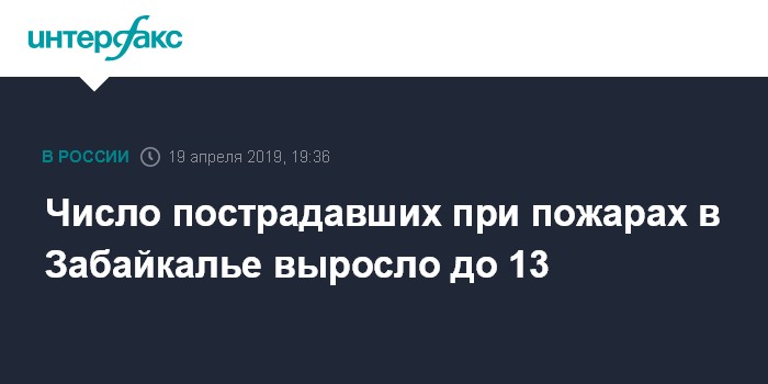 Москва. 19 апреля. INTERFAX.RU - В результате природных пожаров в Забайкальском крае пострадали 13 человек, сообщил в пятницу "Интерфаксу" директор Забайкальского территориального центра медицины катастроф Руслан Долгов.