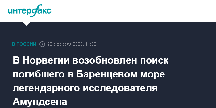 Осло. 28 февраля. ИНТЕРФАКС СЕВЕРО-ЗАПАД - В Норвегии возобновили поиски останков потерпевшего 81 год назад крушение возле острова Медвежий в Баренцевом море самолета, на борту которого находился полярный исследователь Руал Амундсен (Roald Amundsen).