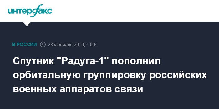 Москва. 28 февраля. INTERFAX.RU - Спутник типа "Радуга-1" вошел в состав российской орбитальной группировки военных спутников связи, заявил в субботу командующий Космическими войсками генерал-майор Олег Остапенко.