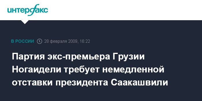 Москва. 28 февраля. INTERFAX.RU - Партия "За справедливую Грузию", возглавляемая бывшим главой грузинского правительства Зурабом Ногаидели, настаивает на немедленной отставке президента страны Михаила Саакашвили.