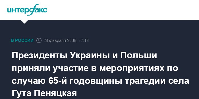 Москва. 28 февраля. INTERFAX.RU - Президенты Украины и Польши Виктор Ющенко и Лех Качиньский приняли участие в поминальных мероприятиях на месте, где 65 лет назад каратели сожгли село Гута Пеняцкая.