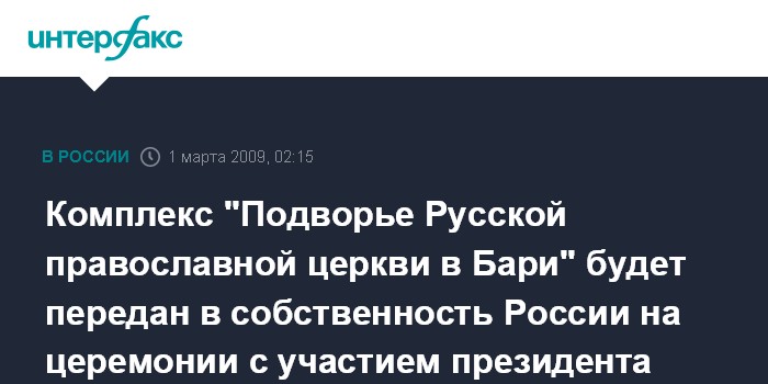 В Москве рассматривают предстоящую 1 марта церемонию передачи российской стороне комплекса "Подворье Русской православной церкви в итальянском городе Бари" как событие исторического масштаба.