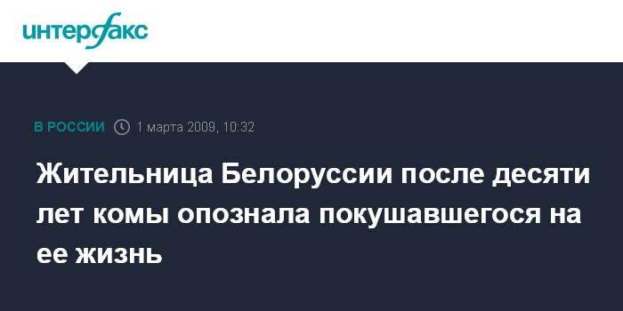 Минск. 1 марта. INTERFAX.RU - Жительница Могилева, которая после покушения на ее жизнь в течение десяти лет находилась в состоянии комы, придя в сознание, опознала преступника и дала показания в суде, сообщил агентству "Интерфакс-Запад" старший следователь по важнейшим делам Могилевской области Александр Вержбицкий.