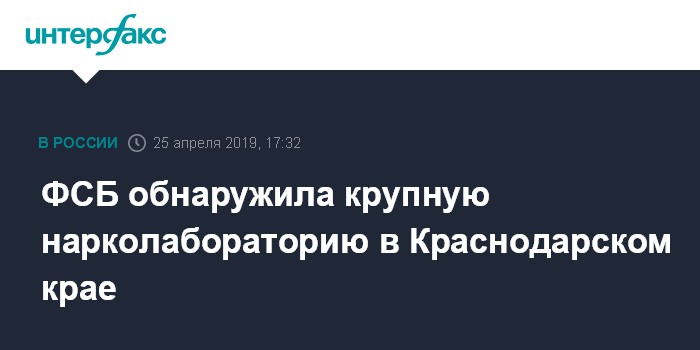 Москва. 25 апреля. INTERFAX.RU - ФСБ РФ сообщает о ликвидации крупной нарколаборатории в Краснодарском крае и изъятии большого объема наркотических веществ и химических реактивов для их производства.