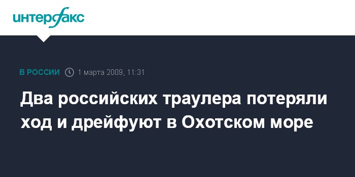 Москва. 1 марта. INTERFAX.RU - В Охотском море два российских траулера "Мыс Олюторский" и "Гиссар" потеряли ход из-за намотки рыболовных сетей на гребные винты, сообщает в воскресенье сайт "Морской бюллетень - Совфрахт".