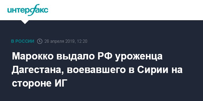 Ранее в пятницу в Генпрокуратуре РФ сообщили, что власти Марокко экстрадировали в Россию члена бандформирований - уроженца Дагестана, который обвиняется по ч. 2 ст. 208 УК РФ (участие в незаконных вооруженных формированиях). Боевика задержали на территории Марокко, и в августе 2018 года Генпрокуратура РФ направила в Минюст этой страны запрос о его выдаче.