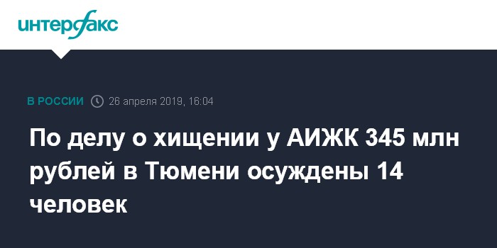 Москва. 26 апреля. INTERFAX.RU - Суд в Тюмени вынес обвинительный приговор 14 фигурантам уголовного дела о хищении у ОАО "Агентство по ипотечному жилищному кредитованию" (АИЖК, с марта 2018 года - АО "ДОМ.РФ") более 345 млн рублей, сообщает в пятницу пресс-служба облпрокуратуры.
