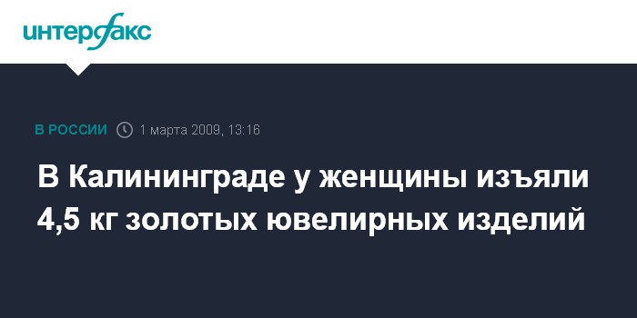 Калининград. 1 марта. INTERFAX.RU - В Калининграде милиция задержала молодую женщину, у которой изъято золотых ювелирных изделий общим весом 4,5 кг, сообщили "Интерфаксу" в воскресенье в региональном УВД.