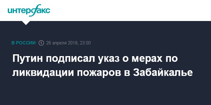 Москва. 26 апреля. INTERFAX.RU - Президент РФ Владимир Путин подписал указ, предусматривающий меры по ликвидации последствий природных пожаров на территории Забайкальского края.