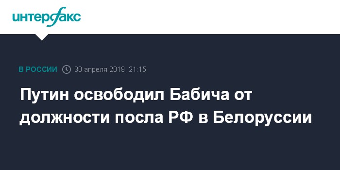 Москва. 30 апреля. INTERFAX.RU - Президент РФ Владимир Путин своим указом освободил Михаила Бабича от обязанностей посла России в Белоруссии, говорится в сообщении на сайте Кремля.